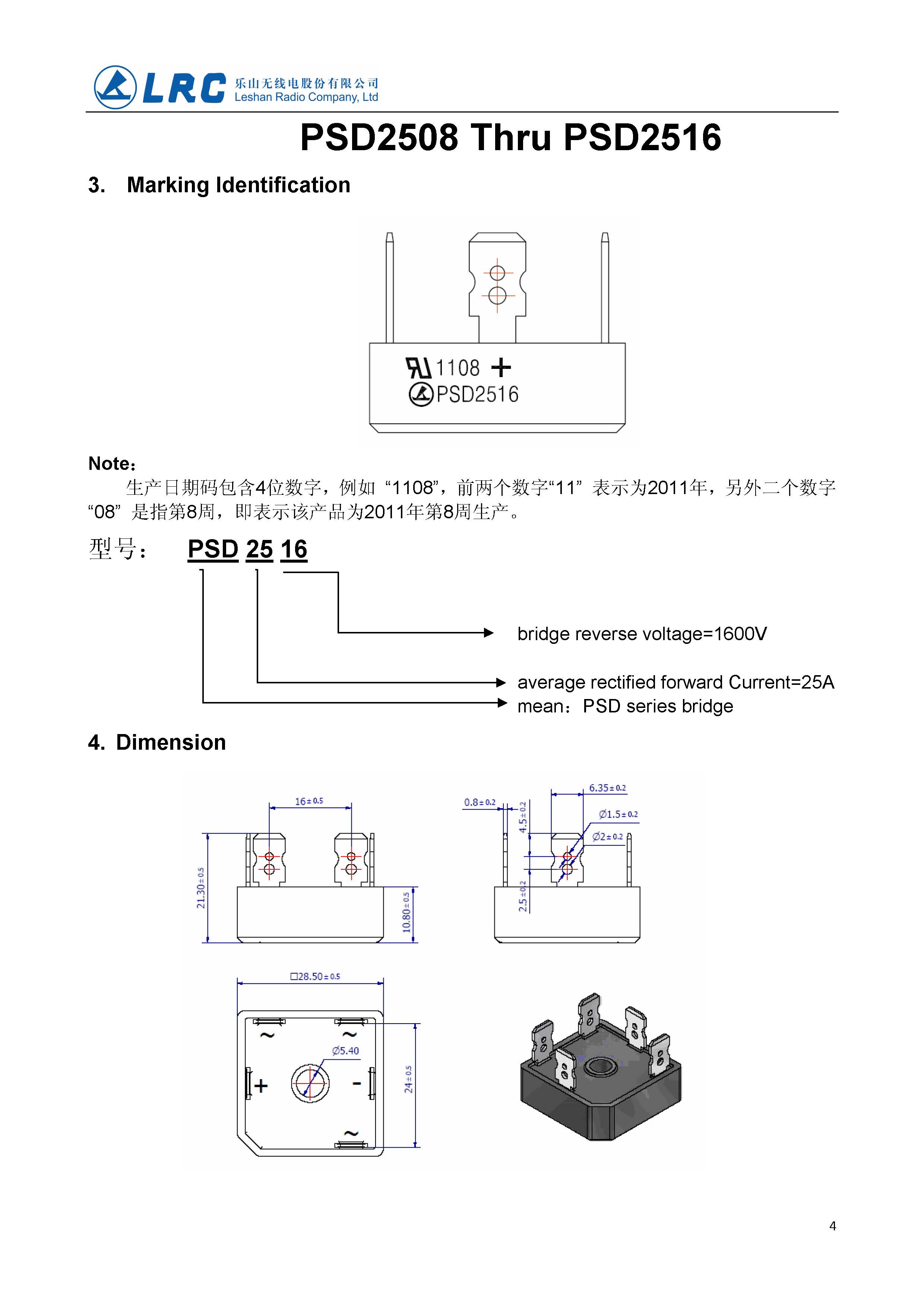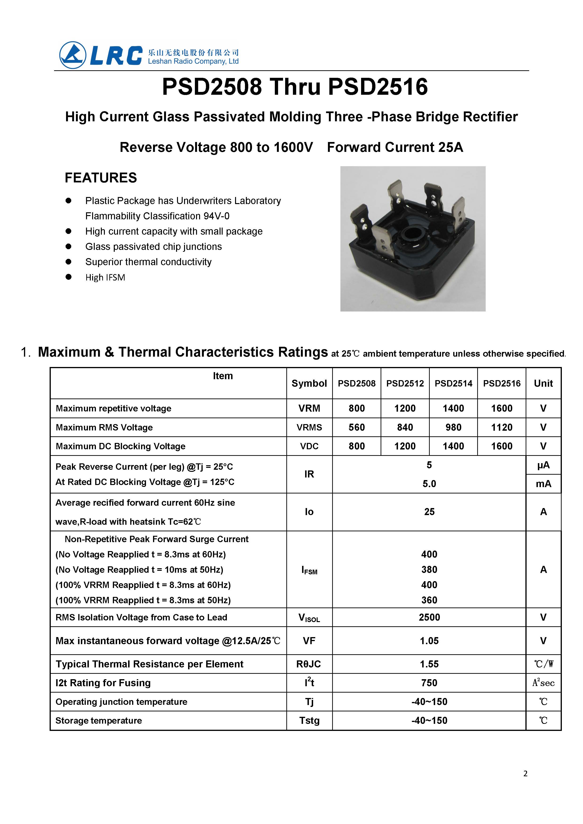 PSD2512 VRRM 1200V VF 1.1V IR 10uA LRC 三相整流二極管
