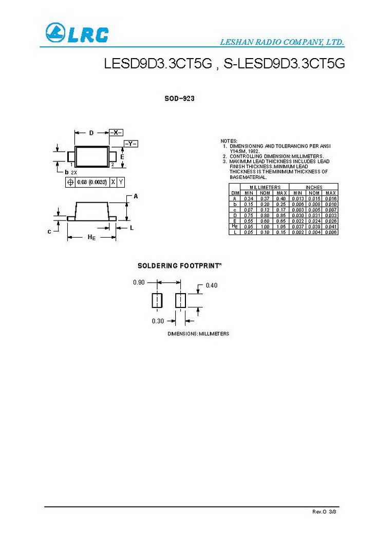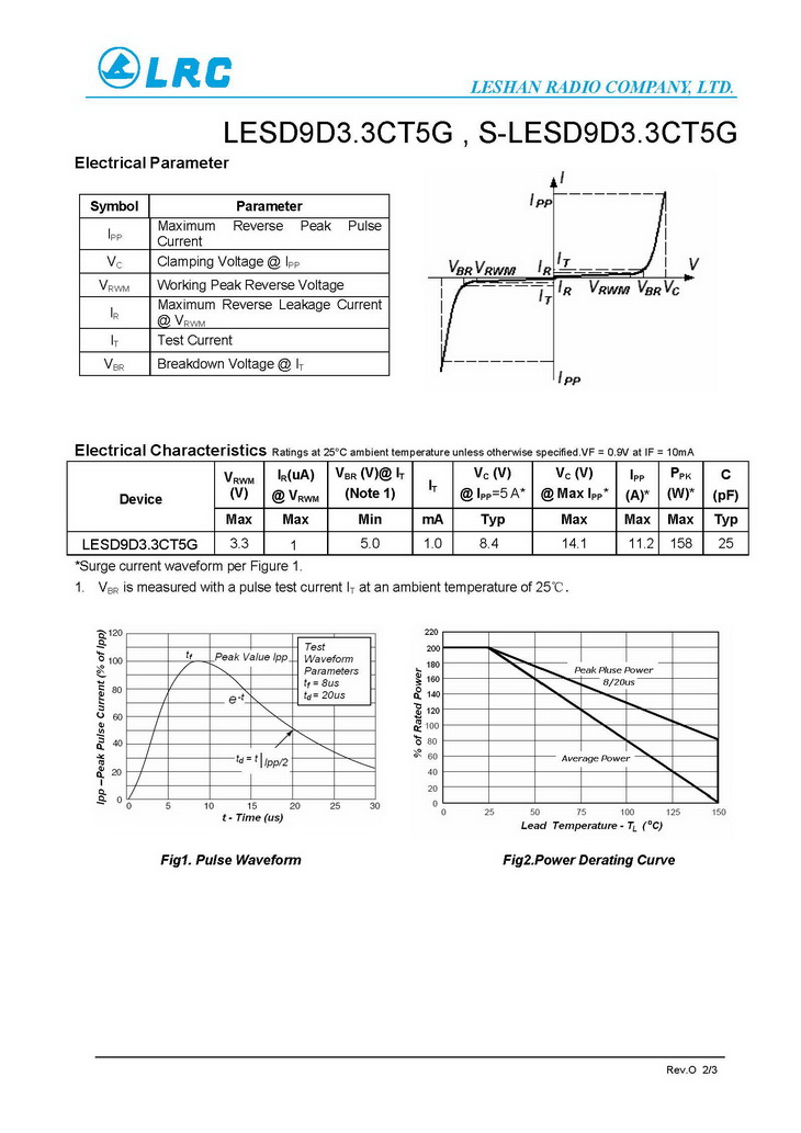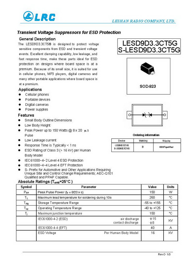 LESD9D3.3CT5G VRM 3.3V VC 14.1V CJ 25pF SOD-923 LRC通用ESD保護二極管