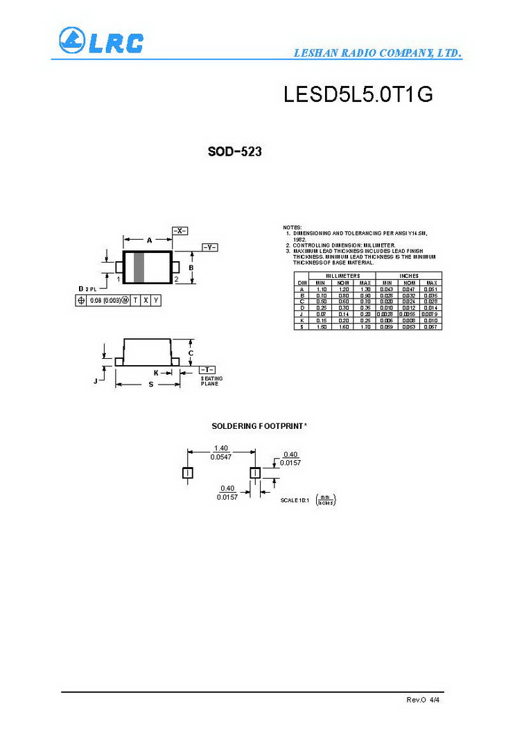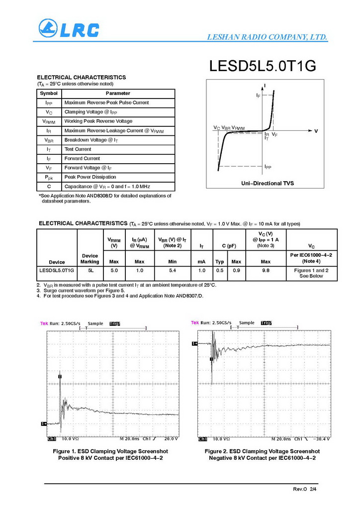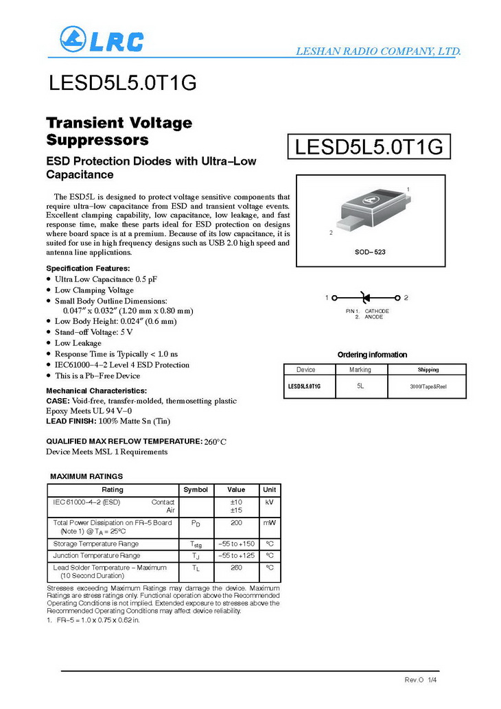 > LESD5L5.0T1G VRM 5V VC 9.8V CJ 0.5pF SOD-523 LRC通用ESD保護二極管