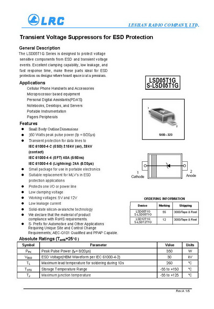 LSD05T1G VRM 5V VC 14.5V CJ 350pF SOD-323 LRC通用ESD保護二極管