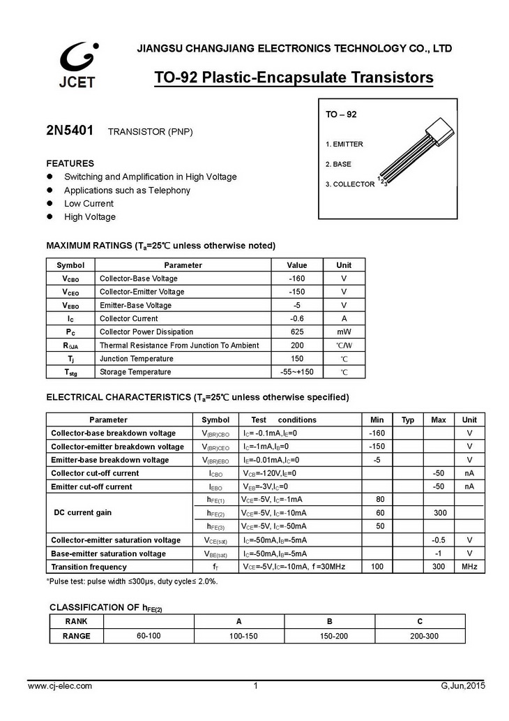 2N5401 PNP 625mW IC=600mA BVCBO=160V TO-92 長電 開關高壓放大晶體管