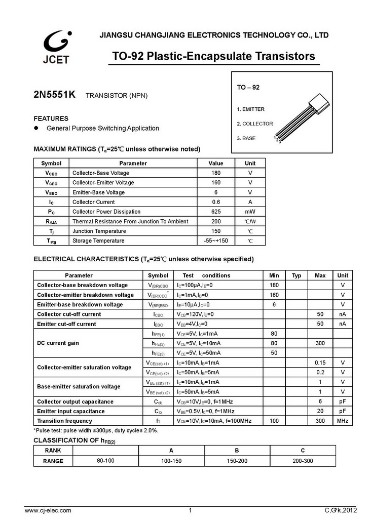 2N5551K NPN 625mW IC=600mA BVCBO=180V TO-92 長(zhǎng)電 開(kāi)關(guān)高壓放大晶體管