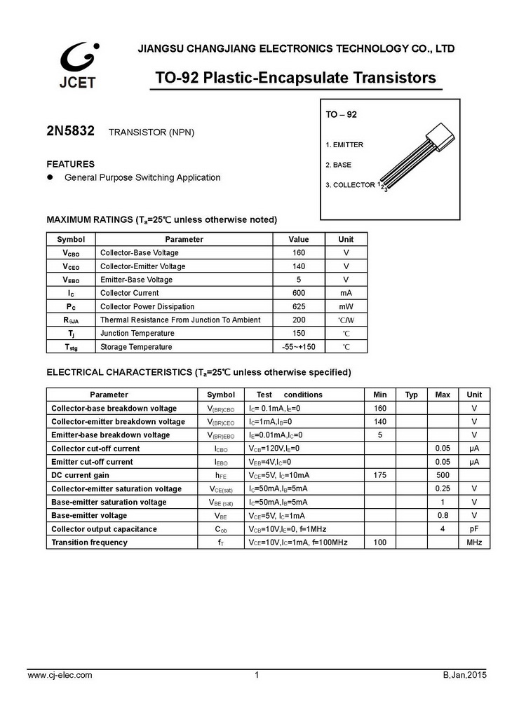 > 2N5832 NPN 625mW IC=600mA BVCBO=160V TO-92 長電 開關高壓放大晶體管