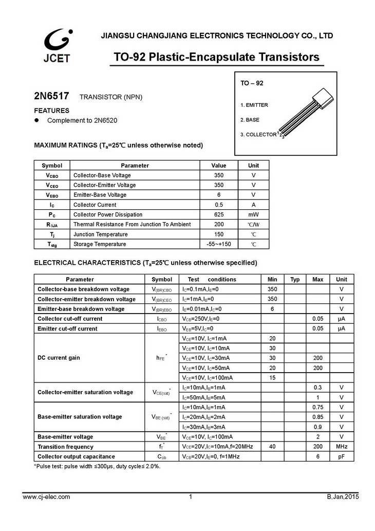 2N6517 NPN 625mW IC=500mA BVCBO=350V TO-92 長(zhǎng)電 開(kāi)關(guān)高壓放大晶體管