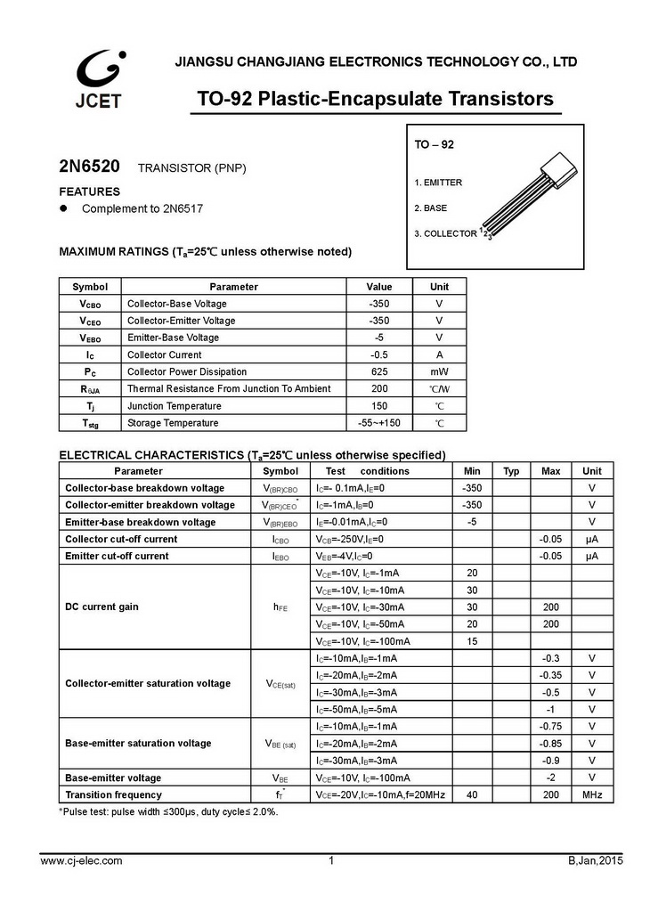 2N6520 PNP 625mW IC=500mA BVCBO=350V TO-92 長電 開關(guān)高壓放大晶體管