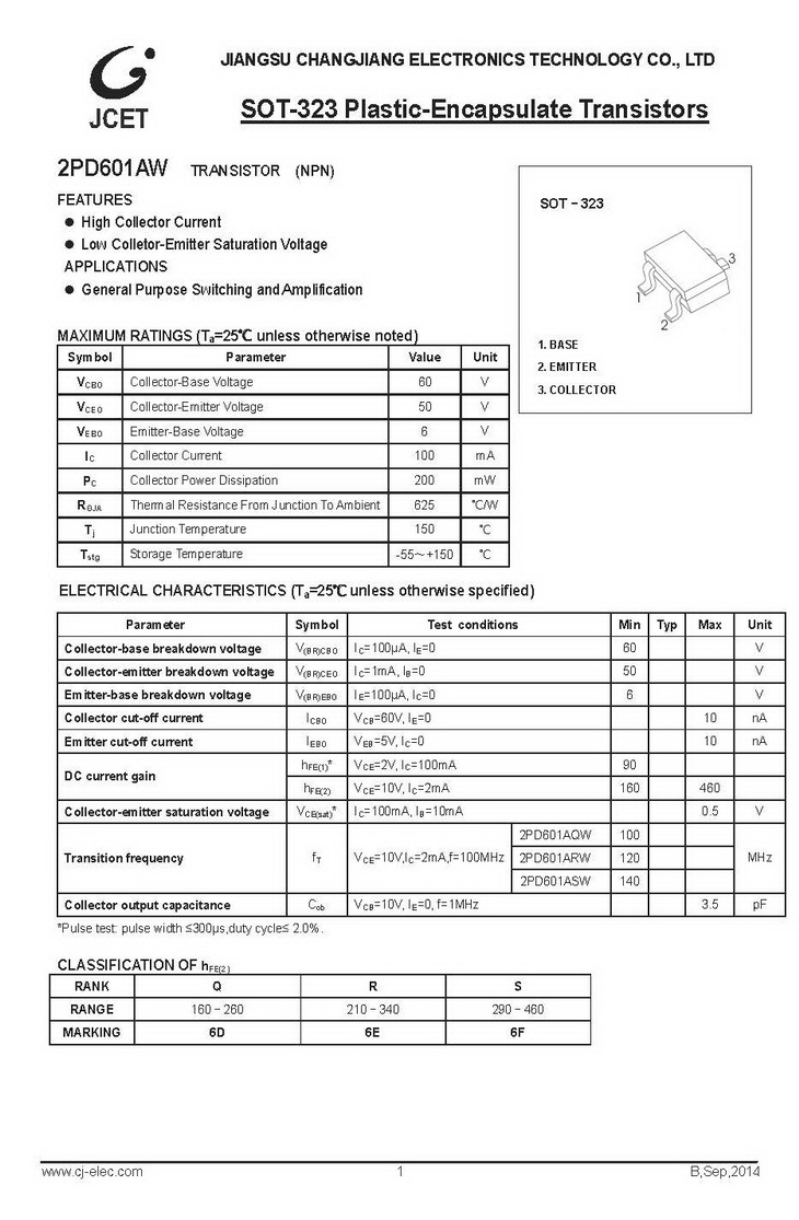 2PD601AW NPN 200mW IC=100mA BVCBO=60V SOT-323長電 開關(guān)放大晶體管