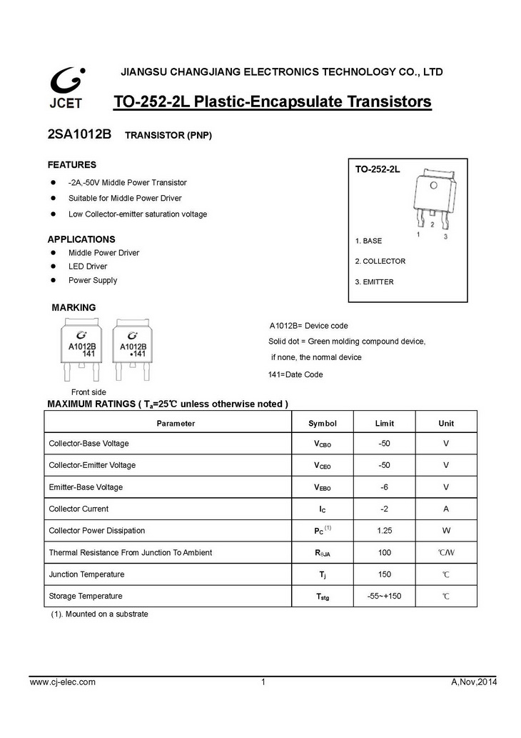 > 2SA1012B PNP 1250mW IC=2000mA BVCBO=50V TO-252-2L(4R)長電 開關放大晶體管