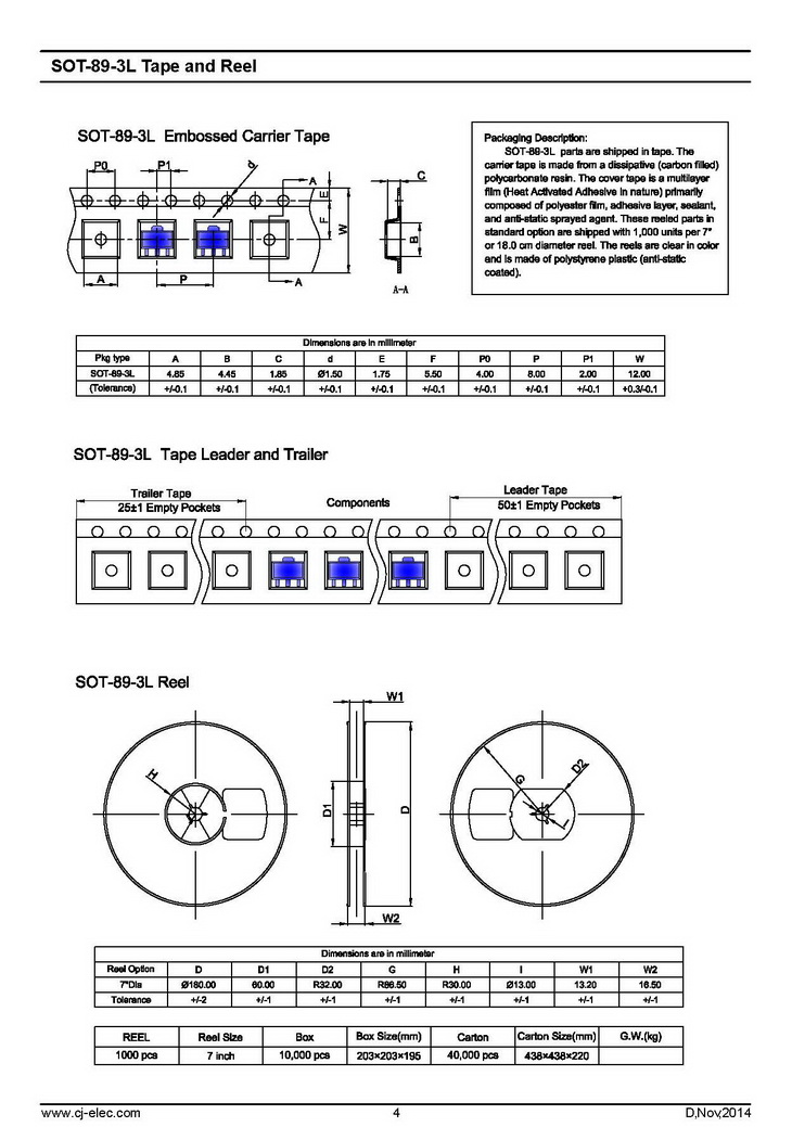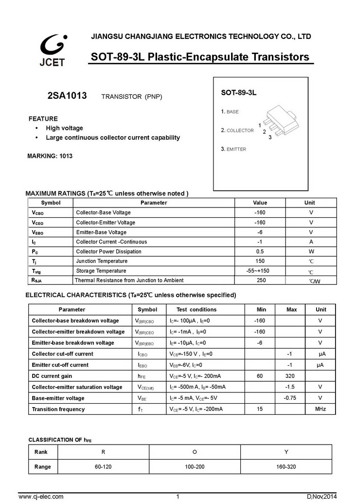 2SA1013 PNP 500mW IC=1000mA BVCBO=160V SOT-89-3L 長電 開關放大晶體管